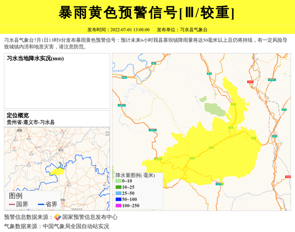 习水县气象台7月1日13时8分发布暴雨黄色预警信号:预计未来6小时我县寨坝镇降雨量将达50毫米以上且仍将持续,有一定风险导致城镇内涝和地质灾害,请注意防范。 信息来源:国家预警信息发布中心; 发布单位:习水县气象台。