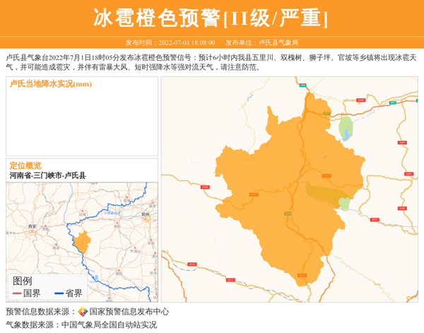 卢氏县气象台2022年7月1日18时05分发布冰雹橙色预警信号:预计6小时内我县五里川、双槐树、狮子坪、官坡等乡镇将出现冰雹天气,并可能造成雹灾,并伴有雷暴大风、短时强降水等强对流天气,请注意防范。 信息来源:国家预警信息发布中心; 发布单位:卢氏县气象局。