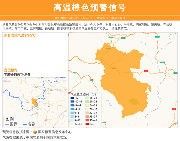 康县气象台2022年06月30日11时45分发布高温橙色预警信号:预计今天下午,我县太石乡、平洛镇、周家坝镇、望关镇、寺台镇、大堡镇、岸门口镇、三河坝镇、白杨镇、阳坝镇等乡镇最高气温将升至37℃以上,请注意防范。 信息来源:国家预警信息发布中心; 发布单位:康县气象台。