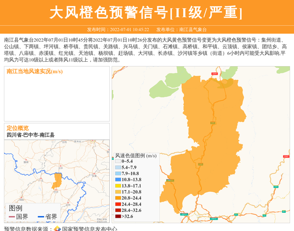 南江县气象台2022年07月01日10时45分将2022年07月01日10时26分发布的大风黄色预警信号变更为大风橙色预警信号:集州街道、公山镇、下两镇、坪河镇、桥亭镇、贵民镇、关路镇、兴马镇、关门镇、石滩镇、高桥镇、和平镇、云顶镇、侯家镇、团结乡、高塔镇、八庙镇、赤溪镇、红光镇、天池镇、杨坝镇、赶场镇、大河镇、长赤镇、沙河镇等乡镇(街道)6小时内可能受大风影响,平均风力可达10级以上或者阵风11级以上,请加强防范。 信息来源:国家预警信息发布中心; 发布单位:南江县气象台。