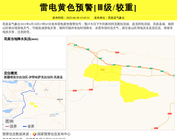 巩留县气象台发布雷电黄色预警[Ⅲ级/较重]