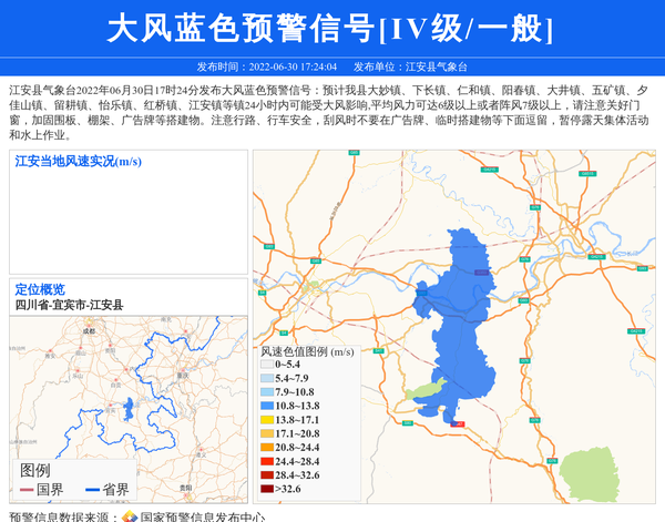江安县气象台2022年06月30日17时24分发布大风蓝色预警信号:预计我县大妙镇、下长镇、仁和镇、阳春镇、大井镇、五矿镇、夕佳山镇、留耕镇、怡乐镇、红桥镇、江安镇等镇24小时内可能受大风影响,平均风力可达6级以上或者阵风7级以上,请注意关好门窗,加固围板、棚架、广告牌等搭建物。注意行路、行车安全,刮风时不要在广告牌、临时搭建物等下面逗留,暂停露天集体活动和水上作业。 信息来源:国家预警信息发布中心; 发布单位:江安县气象台。
