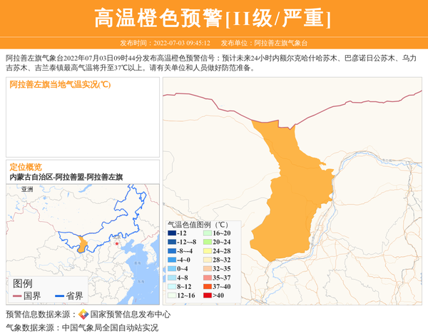 阿拉善左旗气象台2022年07月03日09时44分发布高温橙色预警信号:预计未来24小时内额尔克哈什哈苏木、巴彦诺日公苏木、乌力吉苏木、吉兰泰镇最高气温将升至37℃以上。请有关单位和人员做好防范准备。 信息来源:国家预警信息发布中心; 发布单位:阿拉善左旗气象台。