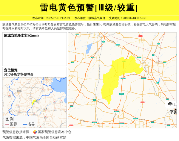 故城县气象台2022年07月03日19时52分发布雷电黄色预警信号:预计未来6小时内故城县全部乡镇,将受雷电天气影响,局地伴有短时强降水和短时大风,请有关单位和人员做好防范准备。 信息来源:国家预警信息发布中心; 发布单位:故城县气象台。