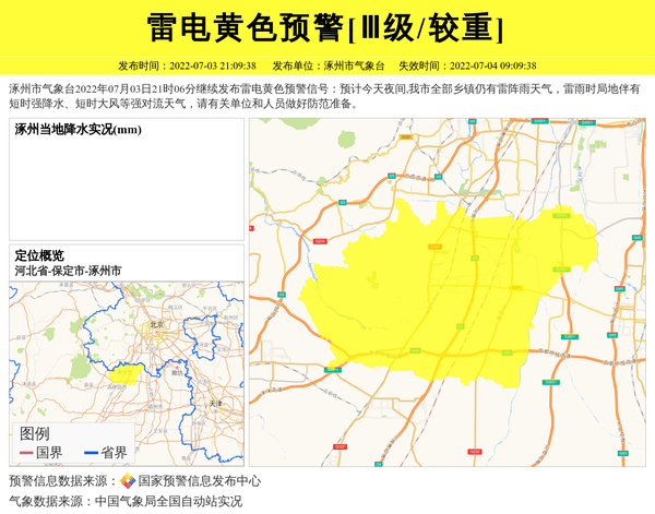 涿州市气象台2022年07月03日21时06分继续发布雷电黄色预警信号:预计今天夜间,我市全部乡镇仍有雷阵雨天气,雷雨时局地伴有短时强降水、短时大风等强对流天气,请有关单位和人员做好防范准备。 信息来源:国家预警信息发布中心; 发布单位:涿州市气象台。