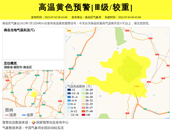 南岳区气象台2022年7月2日8时43分发布高温黄色预警信号:今天白天南岳区最高气温将升至35℃以上,请注意防范。 信息来源:国家预警信息发布中心; 发布单位:南岳区气象局。