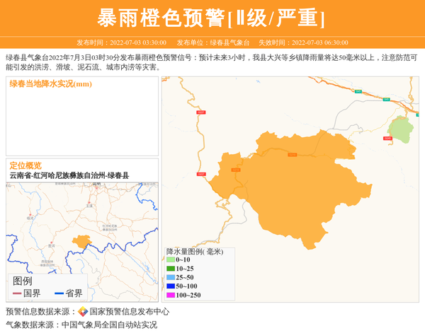 绿春县气象台2022年7月3日03时30分发布暴雨橙色预警信号:预计未来3小时,我县大兴等乡镇降雨量将达50毫米以上,注意防范可能引发的洪涝、滑坡、泥石流、城市内涝等灾害。 信息来源:国家预警信息发布中心; 发布单位:绿春县气象台。