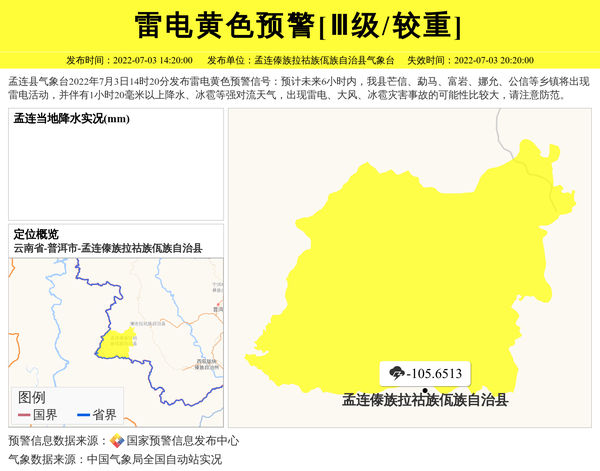 孟连县气象台2022年7月3日14时20分发布雷电黄色预警信号:预计未来6小时内,我县芒信、勐马、富岩、娜允、公信等乡镇将出现雷电活动,并伴有1小时20毫米以上降水、冰雹等强对流天气,出现雷电、大风、冰雹灾害事故的可能性比较大,请注意防范。 信息来源:国家预警信息发布中心; 发布单位:孟连傣族拉祜族佤族自治县气象台。