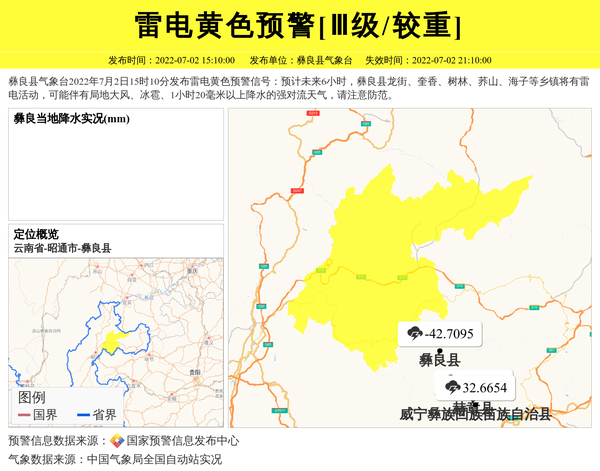 彝良县气象台2022年7月2日15时10分发布雷电黄色预警信号:预计未来6小时,彝良县龙街、奎香、树林、荞山、海子等乡镇将有雷电活动,可能伴有局地大风、冰雹、1小时20毫米以上降水的强对流天气,请注意防范。 信息来源:国家预警信息发布中心; 发布单位:彝良县气象台。