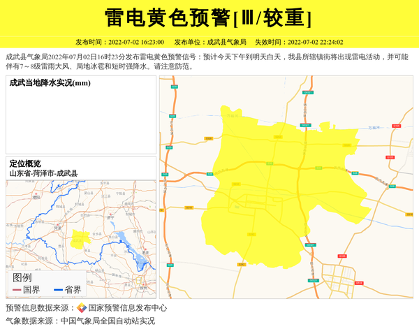 成武县气象局2022年07月02日16时23分发布雷电黄色预警信号:预计今天下午到明天白天,我县所辖镇街将出现雷电活动,并可能伴有7~8级雷雨大风、局地冰雹和短时强降水。请注意防范。 信息来源:国家预警信息发布中心; 发布单位:成武县气象局。