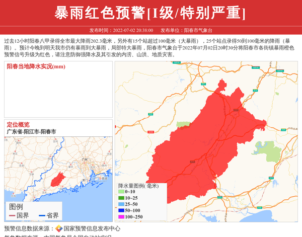 过去12小时阳春八甲录得全市最大降雨202.3毫米,另外有15个站超过100毫米(大暴雨),25个站点录得50到100毫米的降雨(暴雨)。预计今晚到明天我市仍有暴雨到大暴雨,局部特大暴雨,阳春市气象台于2022年07月02日20时30分将阳春市各街镇暴雨橙色预警信号升级为红色,请注意防御强降水及其引发的内涝、山洪、地质灾害。 信息来源:国家预警信息发布中心; 发布单位:阳春市气象台。