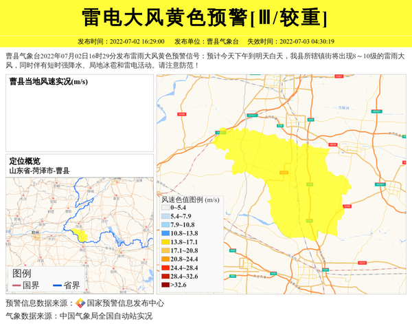 曹县气象台2022年07月02日16时29分发布雷雨大风黄色预警信号:预计今天下午到明天白天,我县所辖镇街将出现8~10级的雷雨大风,同时伴有短时强降水、局地冰雹和雷电活动。请注意防范! 信息来源:国家预警信息发布中心; 发布单位:曹县气象台。