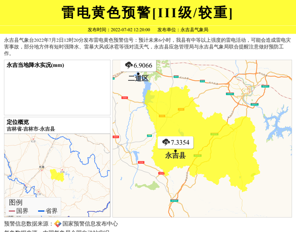 永吉县气象台2022年7月2日12时20分发布雷电黄色预警信号:预计未来6小时,我县有中等以上强度的雷电活动,可能会造成雷电灾害事故,部分地方伴有短时强降水、雷暴大风或冰雹等强对流天气,永吉县应急管理局与永吉县气象局联合提醒注意做好预防工作。 信息来源:国家预警信息发布中心; 发布单位:永吉县气象局。