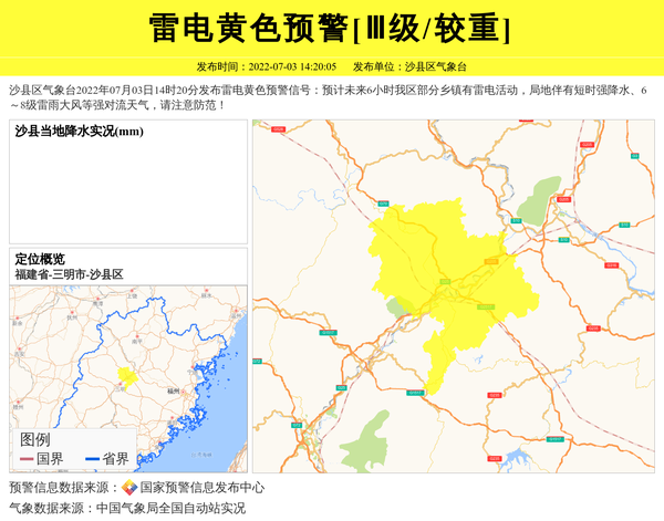 沙县区气象台2022年07月03日14时20分发布雷电黄色预警信号:预计未来6小时我区部分乡镇有雷电活动,局地伴有短时强降水、6~8级雷雨大风等强对流天气,请注意防范! 信息来源:国家预警信息发布中心; 发布单位:沙县区气象台。