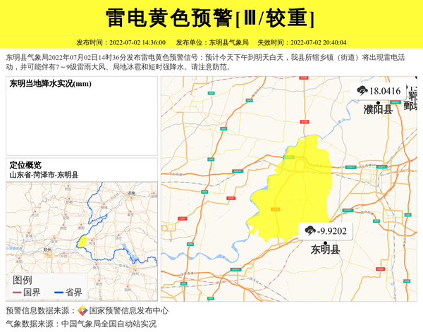 东明县气象局2022年07月02日14时36分发布雷电黄色预警信号:预计今天下午到明天白天,我县所辖乡镇(街道)将出现雷电活动,并可能伴有7~9级雷雨大风、局地冰雹和短时强降水。请注意防范。 信息来源:国家预警信息发布中心; 发布单位:东明县气象局。