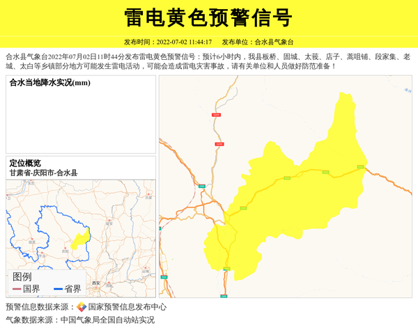 合水县气象台2022年07月02日11时44分发布雷电黄色预警信号:预计6小时内,我县板桥、固城、太莪、店子、蒿咀铺、段家集、老城、太白等乡镇部分地方可能发生雷电活动,可能会造成雷电灾害事故,请有关单位和人员做好防范准备! 信息来源:国家预警信息发布中心; 发布单位:合水县气象台。