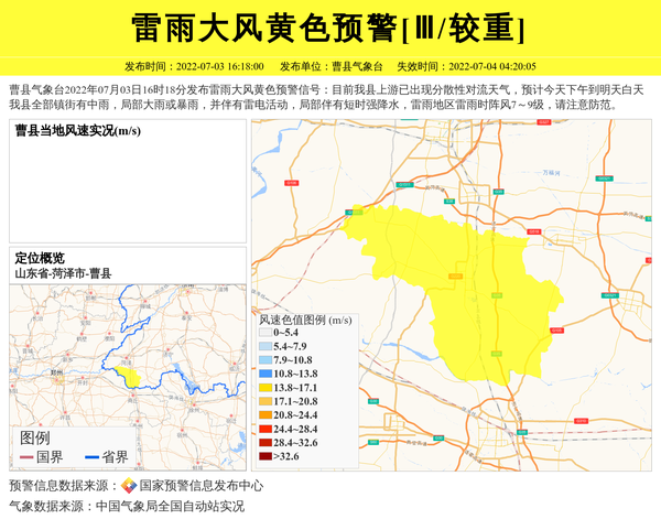 曹县气象台2022年07月03日16时18分发布雷雨大风黄色预警信号:目前我县上游已出现分散性对流天气,预计今天下午到明天白天我县全部镇街有中雨,局部大雨或暴雨,并伴有雷电活动,局部伴有短时强降水,雷雨地区雷雨时阵风7~9级,请注意防范。 信息来源:国家预警信息发布中心; 发布单位:曹县气象台。