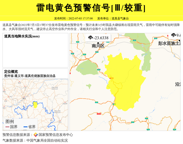 道真县气象台2022年7月3日17时37分发布雷电黄色预警信号:预计未来3小时我县大磏镇将出现雷雨天气,雷雨中可能伴有短时强降水、大风等强对流天气,建议停止高空作业和户外作业,请相关行业和个人注意防范。 信息来源:国家预警信息发布中心; 发布单位:道真县气象台。