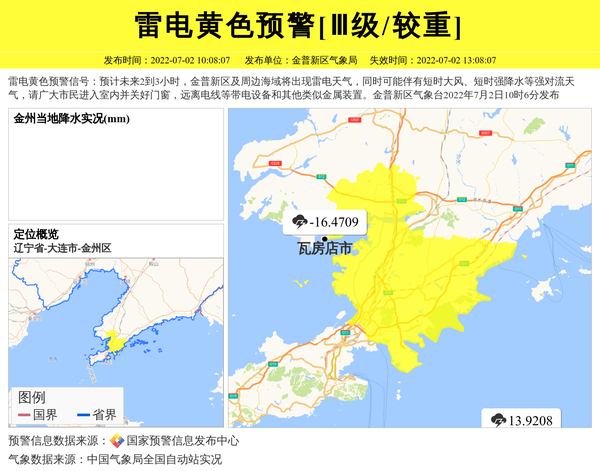 雷电黄色预警信号:预计未来2到3小时,金普新区及周边海域将出现雷电天气,同时可能伴有短时大风、短时强降水等强对流天气,请广大市民进入室内并关好门窗,远离电线等带电设备和其他类似金属装置。金普新区气象台2022年7月2日10时6分发布 信息来源:国家预警信息发布中心; 发布单位:金普新区气象局。