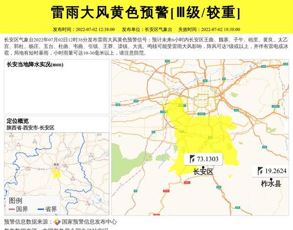 长安区气象台2022年07月02日12时38分发布雷雨大风黄色预警信号:预计未来6小时内长安区王曲、魏寨、子午、砲里、黄良、太乙宫、郭杜、杨庄、五台、杜曲、韦曲、引镇、王莽、滦镇、大兆、鸣犊可能受雷雨大风影响,阵风可达7级或以上,并伴有雷电或冰雹,局地有短时暴雨,小时雨量可达10-30毫米以上,请注意防范。 信息来源:国家预警信息发布中心; 发布单位:长安区气象台。