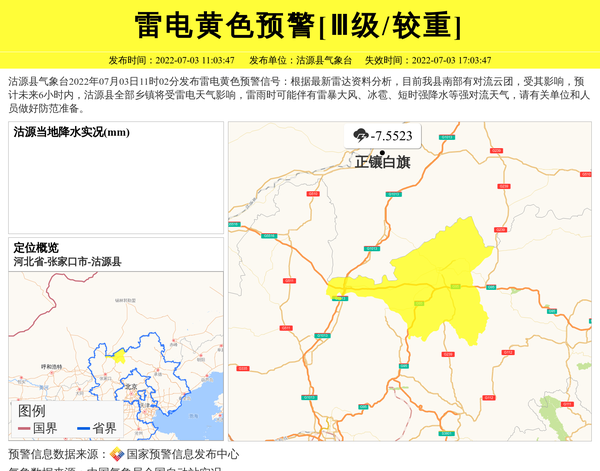 沽源县气象台2022年07月03日11时02分发布雷电黄色预警信号:根据最新雷达资料分析,目前我县南部有对流云团,受其影响,预计未来6小时内,沽源县全部乡镇将受雷电天气影响,雷雨时可能伴有雷暴大风、冰雹、短时强降水等强对流天气,请有关单位和人员做好防范准备。 信息来源:国家预警信息发布中心; 发布单位:沽源县气象台。