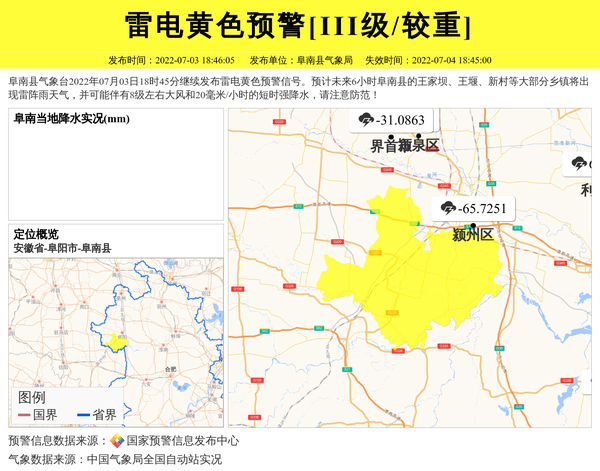 阜南县气象台2022年07月03日18时45分继续发布雷电黄色预警信号。预计未来6小时阜南县的王家坝、王堰、新村等大部分乡镇将出现雷阵雨天气,并可能伴有8级左右大风和20毫米/小时的短时强降水,请注意防范! 信息来源:国家预警信息发布中心; 发布单位:阜南县气象局。