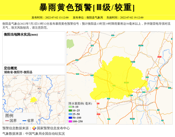 衡阳县气象台2022年7月2日13时12分发布暴雨黄色预警信号:预计衡阳县13时至19时降雨量将达50毫米以上,并伴随雷电等强对流天气,致灾风险较高,请注意防范。 信息来源:国家预警信息发布中心; 发布单位:衡阳县气象局。