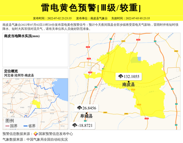 南皮县气象台2022年07月02日23时20分发布雷电黄色预警信号:预计今天夜间我县全部乡镇将受雷电天气影响,雷雨时伴有短时强降水、短时大风等强对流天气,请有关单位和人员做好防范准备。 信息来源:国家预警信息发布中心; 发布单位:南皮县气象台。