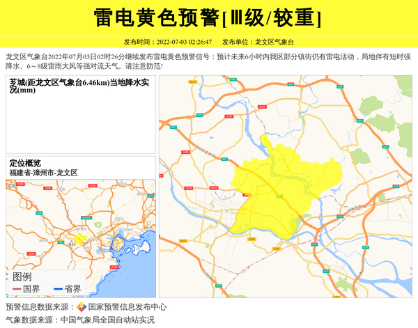 龙文区气象台2022年07月03日02时26分继续发布雷电黄色预警信号:预计未来6小时内我区部分镇街仍有雷电活动,局地伴有短时强降水、6~8级雷雨大风等强对流天气。请注意防范! 信息来源:国家预警信息发布中心; 发布单位:龙文区气象台。