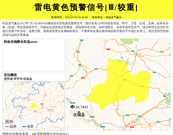 织金县气象台2022年7月3日1时48分继续发布雷电黄色预警信号:预计未来3小时内我县鸡场、阿弓、少普、白泥、文腾、金凤等乡镇(街道)将出现雷雨天气,可能会造成雷电灾害事故,局地将伴有大风、短时强降水、冰雹等强对流天气。请立即停止在空旷的地方开展户外活动,远离大树、墙角或有突出金属物的地方,不要将有金属尖角的物品朝天握在手中或扛在肩上,请注意防范雷电活动引起的灾害事故。 信息来源:国家预警信息发布中心; 发布单位:织金县气象台。