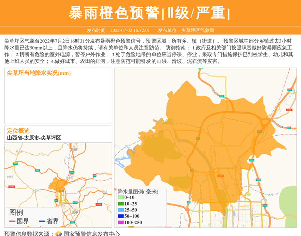 尖草坪区气象台2022年7月2日16时31分发布暴雨橙色预警信号,预警区域:所有乡、镇(街道)。 预警区域中部分乡镇过去3小时降水量已达50mm以上,且降水仍将持续,请有关单位和人员注意防范。 防御指南: 1.政府及相关部门按照职责做好防暴雨应急工作; 2.切断有危险的室外电源,暂停户外作业; 3.处于危险地带的单位应当停课、停业,采取专门措施保护已到校学生、幼儿和其他上班人员的安全; 4.做好城市、农田的排涝,注意防范可能引发的山洪、滑坡、泥石流等灾害。 信息来源:国家预警信息发布中心; 发布单位:尖草坪区气象局。