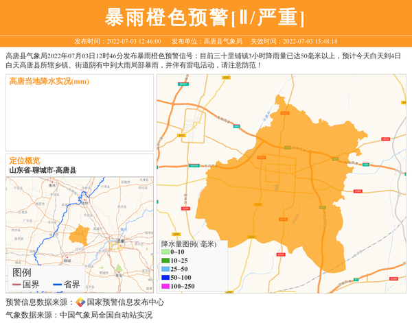 高唐县气象局2022年07月03日12时46分发布暴雨橙色预警信号:目前三十里铺镇3小时降雨量已达50毫米以上,预计今天白天到4日白天高唐县所辖乡镇、街道阴有中到大雨局部暴雨,并伴有雷电活动,请注意防范! 信息来源:国家预警信息发布中心; 发布单位:高唐县气象局。