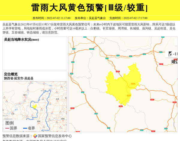 吴起县气象台2022年07月02日11时17分发布雷雨大风黄色预警信号:未来6小时内下述地区可能受雷雨大风影响,阵风可达7级或以上并伴有雷电,局地短时暴雨或冰雹,小时雨量可达10毫米以上:白豹镇、长官庙镇、周湾镇、长城镇、庙沟镇、吴起街道、吴仓堡镇、五谷城镇、铁边城镇,请注意防范。 信息来源:国家预警信息发布中心; 发布单位:吴起县气象台。