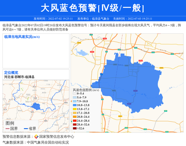 临漳县气象台2022年07月02日19时20分发布大风蓝色预警信号:预计今天夜间我县全部乡镇将出现大风天气,平均风力4~5级,阵风可达6~7级,请有关单位和人员做好防范准备 信息来源:国家预警信息发布中心; 发布单位:临漳县气象台。