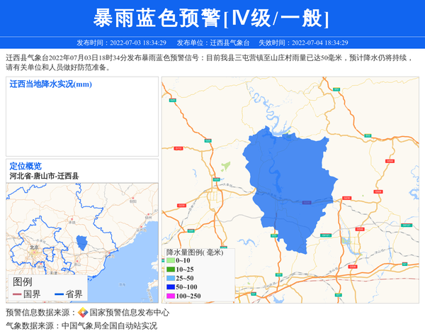 迁西县气象台2022年07月03日18时34分发布暴雨蓝色预警信号:目前我县三屯营镇至山庄村雨量已达50毫米,预计降水仍将持续,请有关单位和人员做好防范准备。 信息来源:国家预警信息发布中心; 发布单位:迁西县气象台。