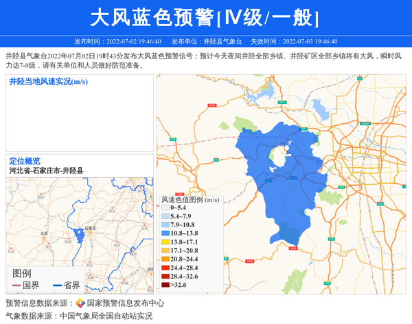 井陉县气象台2022年07月02日19时43分发布大风蓝色预警信号:预计今天夜间井陉全部乡镇、井陉矿区全部乡镇将有大风,瞬时风力达7-8级,请有关单位和人员做好防范准备。 信息来源:国家预警信息发布中心; 发布单位:井陉县气象台。