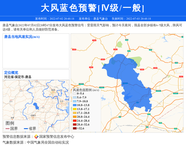 唐县气象台2022年07月02日20时47分发布大风蓝色预警信号:受雷雨天气影响,预计今天夜间,我县全部乡镇有6-7级大风,阵风可达8级,请有关单位和人员做好防范准备。 信息来源:国家预警信息发布中心; 发布单位:唐县气象台。