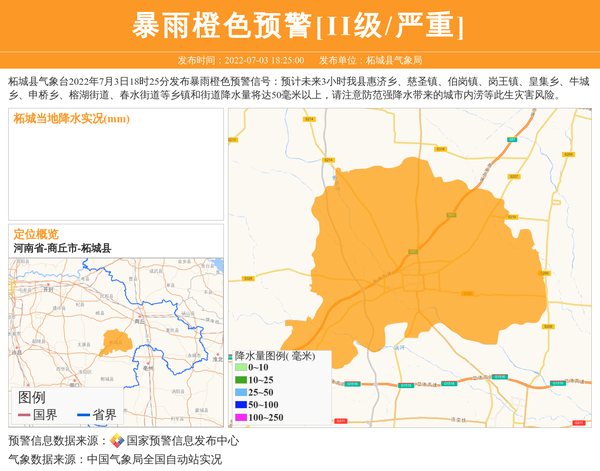 柘城县气象台2022年7月3日18时25分发布暴雨橙色预警信号:预计未来3小时我县惠济乡、慈圣镇、伯岗镇、岗王镇、皇集乡、牛城乡、申桥乡、榕湖街道、春水街道等乡镇和街道降水量将达50毫米以上,请注意防范强降水带来的城市内涝等此生灾害风险。 信息来源:国家预警信息发布中心; 发布单位:柘城县气象局。