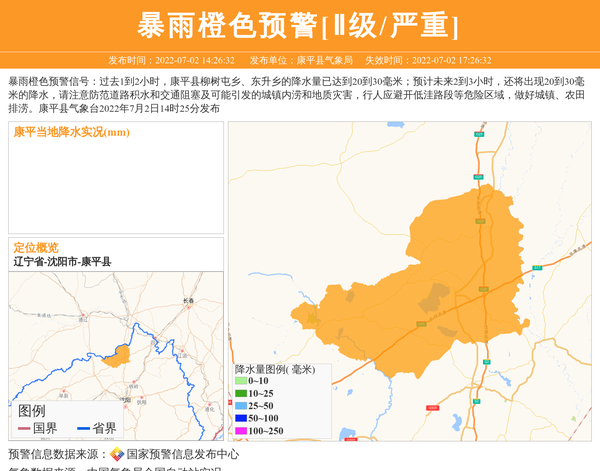 暴雨橙色预警信号:过去1到2小时,康平县柳树屯乡、东升乡的降水量已达到20到30毫米;预计未来2到3小时,还将出现20到30毫米的降水,请注意防范道路积水和交通阻塞及可能引发的城镇内涝和地质灾害,行人应避开低洼路段等危险区域,做好城镇、农田排涝。康平县气象台2022年7月2日14时25分发布 信息来源:国家预警信息发布中心; 发布单位:康平县气象局。