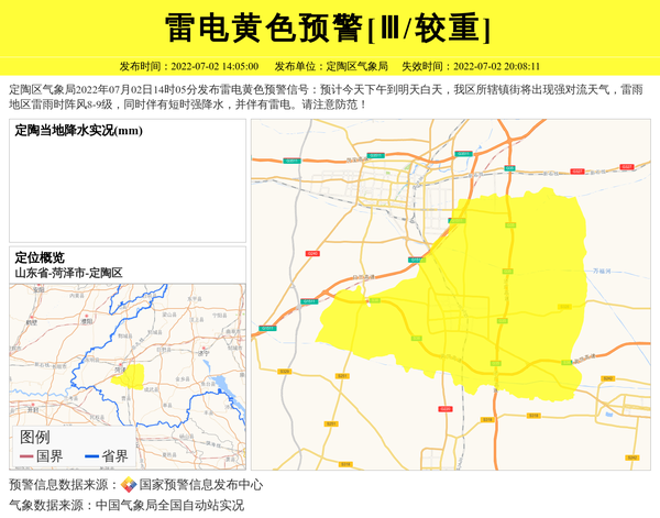定陶区气象局2022年07月02日14时05分发布雷电黄色预警信号:预计今天下午到明天白天,我区所辖镇街将出现强对流天气,雷雨地区雷雨时阵风8-9级,同时伴有短时强降水,并伴有雷电。请注意防范! 信息来源:国家预警信息发布中心; 发布单位:定陶区气象局。