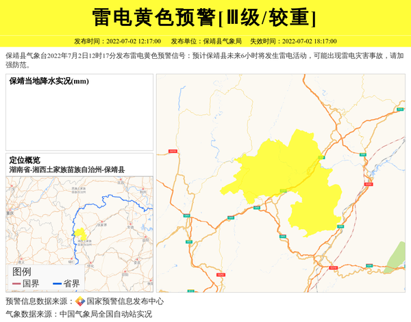 保靖县气象台2022年7月2日12时17分发布雷电黄色预警信号:预计保靖县未来6小时将发生雷电活动,可能出现雷电灾害事故,请加强防范。 信息来源:国家预警信息发布中心; 发布单位:保靖县气象局。