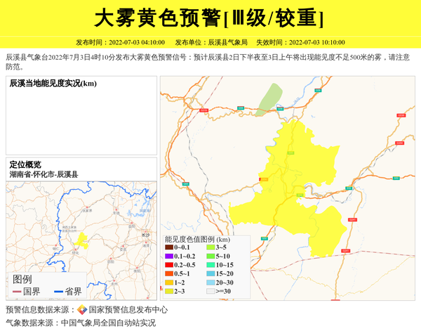 辰溪县气象台2022年7月3日4时10分发布大雾黄色预警信号:预计辰溪县2日下半夜至3日上午将出现能见度不足500米的雾,请注意防范。 信息来源:国家预警信息发布中心; 发布单位:辰溪县气象局。