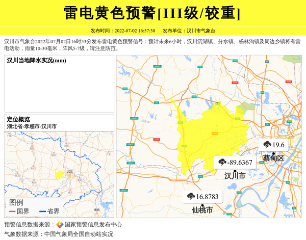 汉川市气象台2022年07月02日16时53分发布雷电黄色预警信号:预计未来6小时,汉川沉湖镇、分水镇、杨林沟镇及周边乡镇将有雷电活动,雨量10-30毫米,阵风5-7级,请注意防范。 信息来源:国家预警信息发布中心; 发布单位:汉川市气象台。