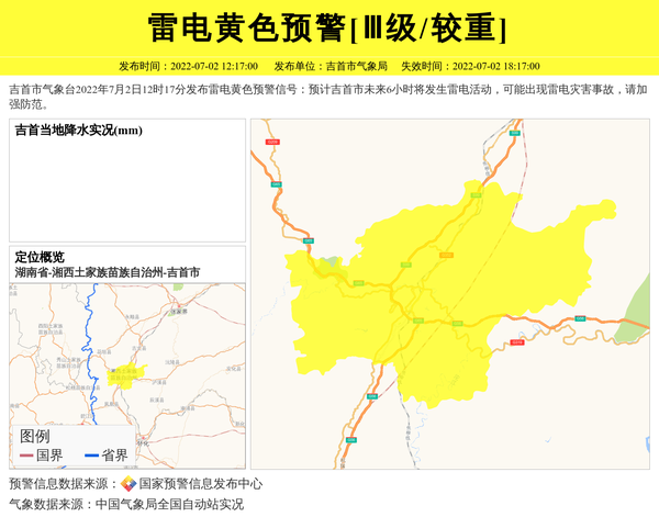 吉首市气象台2022年7月2日12时17分发布雷电黄色预警信号:预计吉首市未来6小时将发生雷电活动,可能出现雷电灾害事故,请加强防范。 信息来源:国家预警信息发布中心; 发布单位:吉首市气象局。