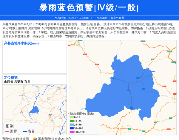 兴县气象台2022年7月2日23时48分发布暴雨蓝色预警信号,预警区域:全县。 预计未来12小时预警区域内部分地区将出现雨强30毫米/小时以上的降雨;局部地区12小时内降雨量将达50毫米以上。请有关单位和人员做好防范准备。防御指南:1.政府及相关部门按照职责做好防暴雨准备工作;2.学校、幼儿园采取适当措施,保证学生和幼儿安全,人员留在室内,并关好门窗;3.驾驶人员应当注意道路积水和交通阻塞,确保安全;4.检查城市、农田排水系统,做好排涝准备。 信息来源:国家预警信息发布中心; 发布单位:兴县气象局。