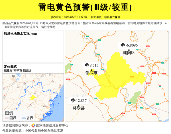 顺昌县气象台2022年07月03日15时34分发布雷电黄色预警信号:预计未来6小时内我县有雷电活动,雷雨时局地伴有短时强降水、6~8级雷雨大风等强对流天气。请注意防范! 信息来源:国家预警信息发布中心; 发布单位:顺昌县气象台。