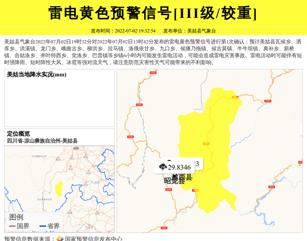 美姑县气象台2022年07月02日19时32分对2022年07月02日13时42分发布的雷电黄色预警信号进行第1次确认:预计美姑县瓦候乡、洒库乡、洪溪镇、龙门乡、峨曲古乡、柳洪乡、拉马镇、洛俄依甘乡、九口乡、候播乃拖镇、候古莫镇、牛牛坝镇、典补乡、新桥镇、合姑洛乡、井叶特西乡、觉洛乡、巴普镇等乡镇6小时内可能发生雷电活动,可能会造成雷电灾害事故。雷电活动时可能伴有短时强降雨、短时阵性大风、冰雹等强对流天气,请注意防范灾害性天气可能带来的不利影响。 信息来源:国家预警信息发布中心; 发布单位:美姑县气象台。