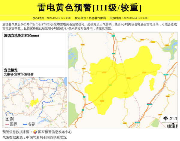 旌德县气象台2022年07月03日17时23分发布雷电黄色预警信号。受强对流天气影响,预计6小时内我县将发生雷电活动,可能会造成雷电灾害事故,且蔡家桥镇已经出现小时雨强31.4毫米的短时强降雨,请注意防范。 信息来源:国家预警信息发布中心; 发布单位:旌德县气象局。