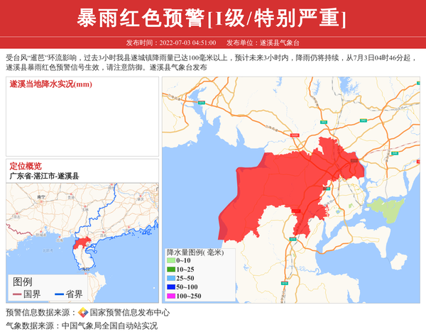 受台风“暹芭”环流影响,过去3小时我县遂城镇降雨量已达100毫米以上,预计未来3小时内,降雨仍将持续,从7月3日04时46分起,遂溪县暴雨红色预警信号生效,请注意防御。遂溪县气象台发布 信息来源:国家预警信息发布中心; 发布单位:遂溪县气象台。