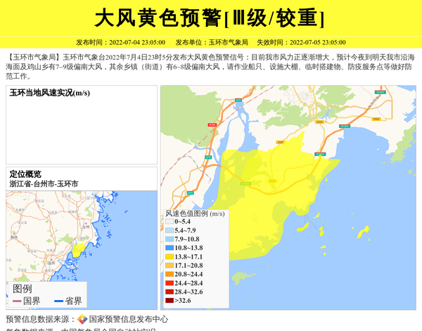 【玉环市气象局】玉环市气象台2022年7月4日23时5分发布大风黄色预警信号:目前我市风力正逐渐增大,预计今夜到明天我市沿海海面及鸡山乡有7~9级偏南大风,其余乡镇(街道)有6~8级偏南大风,请作业船只、设施大棚、临时搭建物、防疫服务点等做好防范工作。 信息来源:国家预警信息发布中心; 发布单位:玉环市气象局。